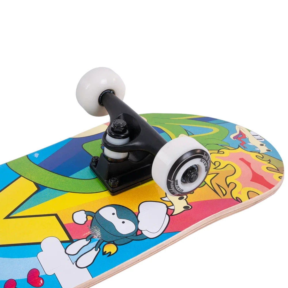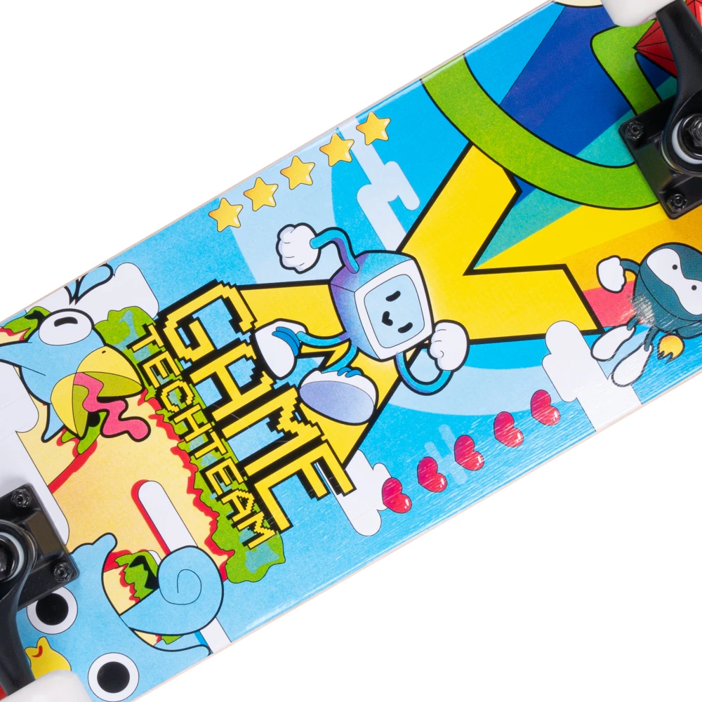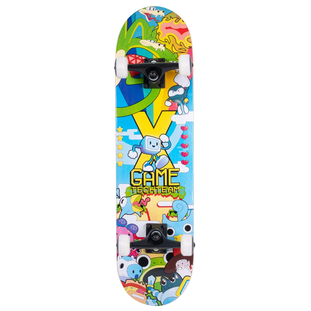 Скейтборд Tech Team X-Game 2024 желтого цвета, сделан компанией Tech Team, несомненно стоит внимания. Дека скейтборда изготовлена из 9 слоев китайского клена, что делает этот деревянный скейтборд прочным и надежным. Размер деки 31"х 8", подходит как для взрослых, так и для детей. Верхняя часть покрыта черной шкуркой стандарта жесткости 80AB, обеспечивающей хорошую сцепляемость. Нижняя часть украшена уникальным принтом в желтых тонах, прекрасно сочетающим в себе стиль и безумно яркие образы персонажей 8-битных игр. Материал колес - PU 52x32 mm, жесткость 85А. Подшипники стандарта ABEC 9 на колесах обеспечивают плавное и ровное катание. Тип деки - двойной концевой загиб (Double Kick), что позволяет прокачать навыки трюков. Этот скейтборд, безусловно, подойдет для новичков, желающих научиться основам катания, и для опытных райдеров. В общем, купить скейтборд Tech Team X-Game 2024 - замечательный выбор для любителей городских поездок и парковых трюков.
