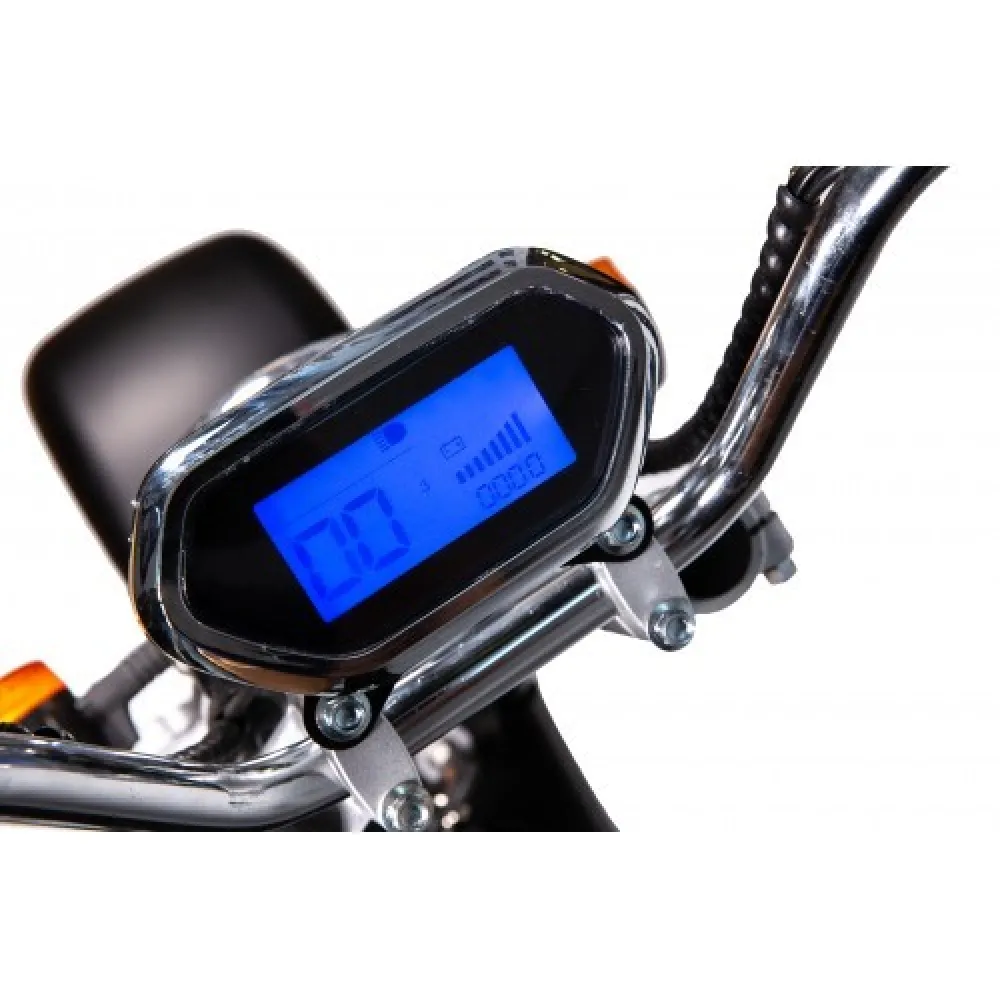 Скутер Citycoco X11 Pro Max имеет электронный дисплей, который отражает все основные параметры. На нем видно уровень заряда батареи, скорость передвижения и дальность пути. Внешнее освещение модели состоит из яркой диодной фары, указателей поворотов, стоп-сигнала. В темное время можно безопасно передвигаться по дорогам. Скутер можно приобрести на нашем сайте, по оптимальной цене.