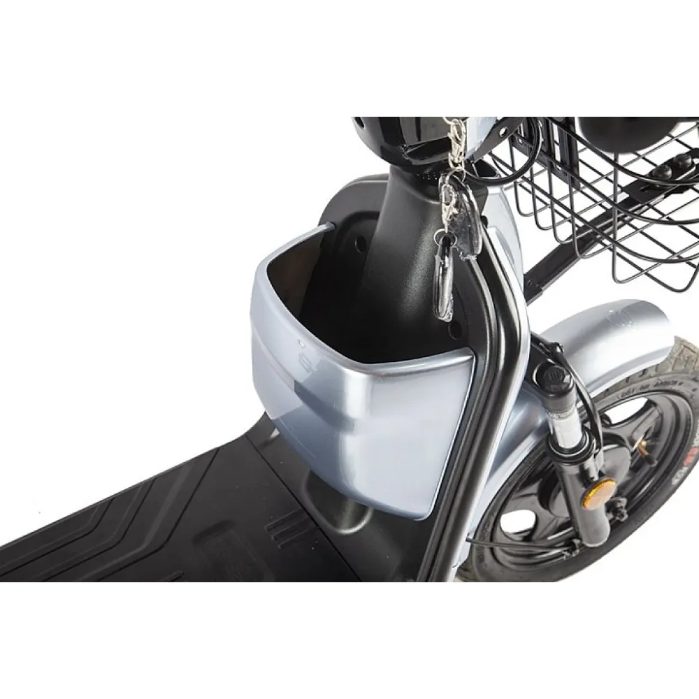 При мощности 350 Вт техника способна разогнаться до 20 км/час, что достаточно для езды по городской местности. На рулевой части электроскутера имеется необходимый для безопасного и контролируемого движения функционал. Благодаря ему райдер может оценивать скоростные характеристики и заряд АКБ (обращаем внимание, в комплектацию с техникой батарея не входит).