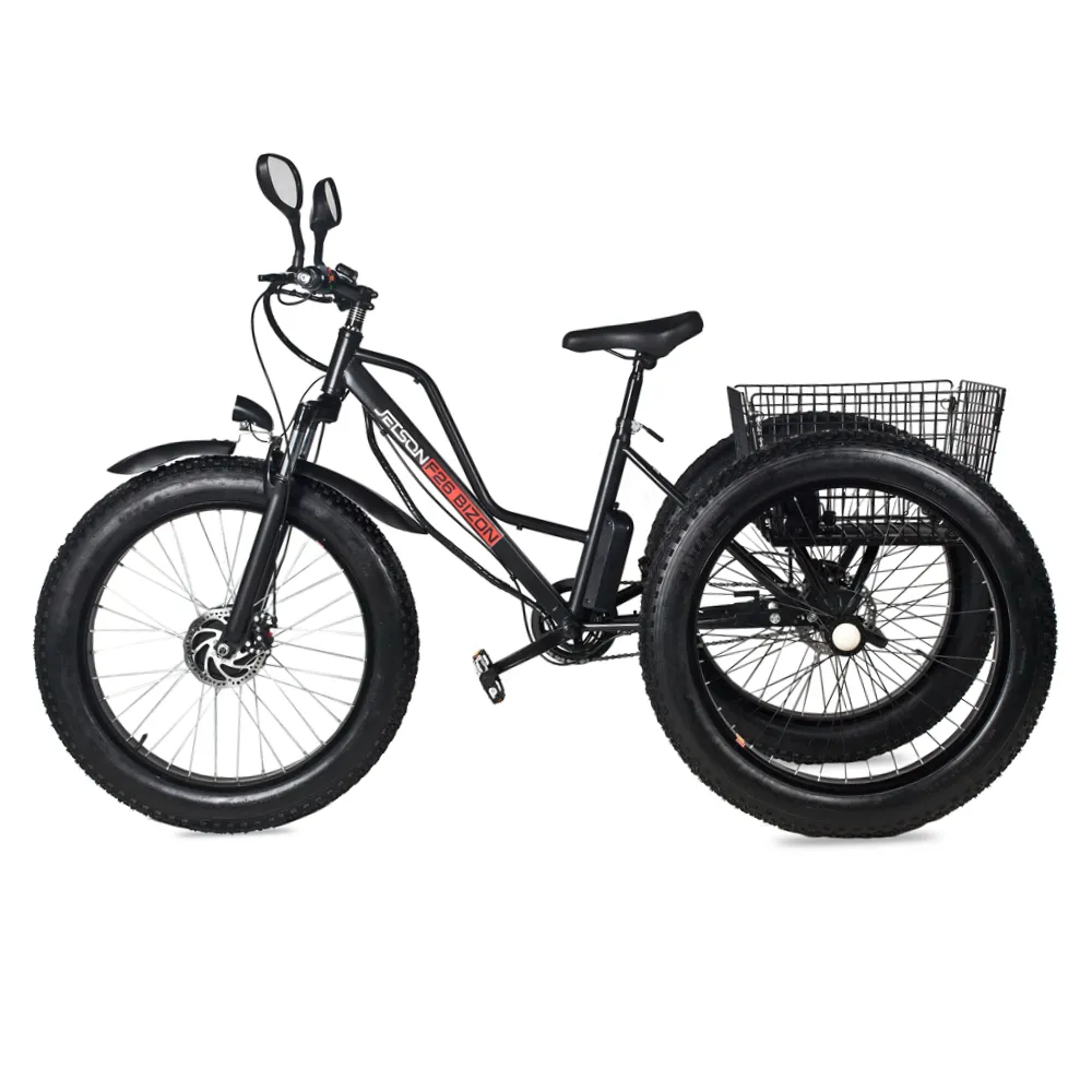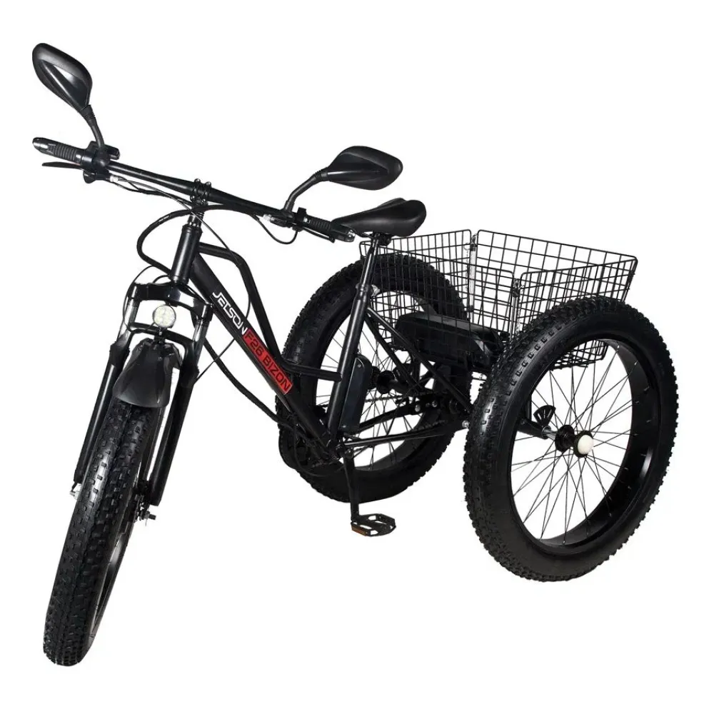 Электровелосипед Трицикл Jetson F26 BIZON (48V12Ah) черный с практической точки зрения выгодный для жителей сельской местности и собственников коттеджей, расположенных в отдаленности от города. Купить трицикл грузоподъемностью 200 кг вместимостью 1 чел. по цене производителя предлагает наш интернет-магазин.
