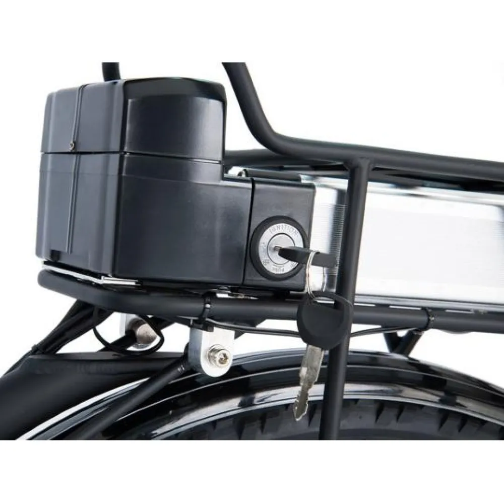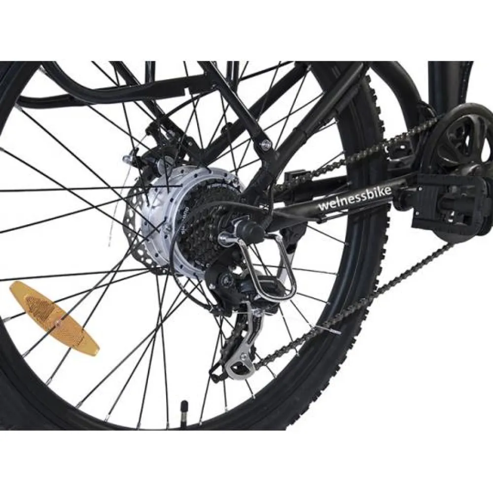 Электровелосипед Wellness CROSS RACK оборудован двигателем мощностью 750 Вт, он позволяет преодолевать большие расстояния и крутые подъемы. Максимальная скорость, развиваемая транспортным средством, составляет 40 км/ч. Аккумулятор емкостью 12 А*ч позволяет проехать на одном заряде свыше 40 км, в зависимости от режима движения.