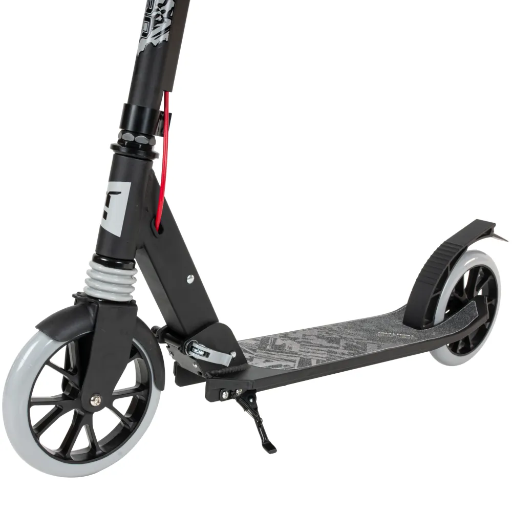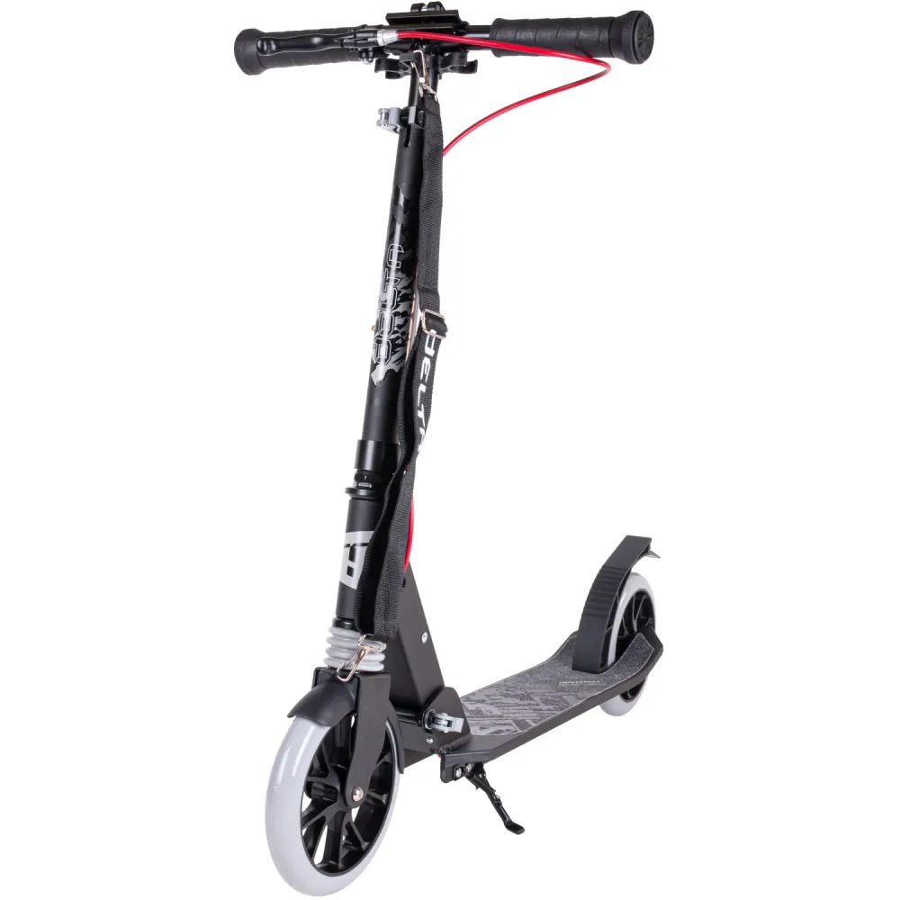 Самокат Tech Team Delta 2023 черно-серый – классический вариант складной техники стал лидером продаж этого сезона. Благодаря облегченному алюминию масса самоката составляет 4,4 кг. Возрастная категория пользователей – 5+. Предназначение – активная езда в пределах городской местности и парковой зоны. Приобрести самокат сейчас, без переплат позволит сотрудничество с нашим интернет-магазином. Из преимущественных качественных характеристик производитель выделяет удобную форму руля и нескользящую платформу. Рулевая часть прочная и надежная, высотой 750-820-890 мм оснащена прорезиненными анатомическими грипсами, которые обеспечивают надежный хват. Колеса диаметром 180 мм накатистые и скоростные, изготовлена из нестираемого полиуретана. Оснащенность подшипниками, гарантируют максимальный разгон. Платформа представлена размерами 136мм*440мм по ширине и длине, покрыта нескользящей шкуркой, исключающей непредвиденные действия со стороны райдера и случайное падение. Торможение проводится с использованием фирменной тормозной системы. Надеемся, вы остались в восторге от современной техники и ее характеристик. Предлагаем подарить радость и восторг ребенку прямо сейчас!