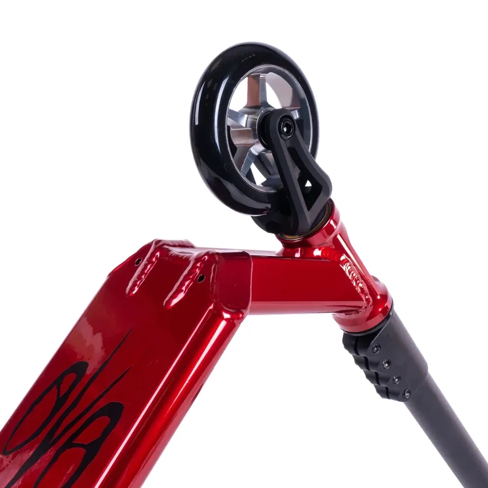 Дека самоката изготовлена из прочного алюминия ALU 6061, что обеспечивает надежность и долговечность конструкции. Красный цвет придает самокату стильный и энергичный вид. Колеса изготовлены из полиуретана, обеспечивая отличную амортизацию и плавную езду.