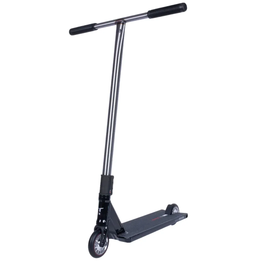 Особое внимание уделено деке самоката: её длина составляет 540 мм, а узкая ширина в 15 мм помогает быстро реагировать на изменения направления и облегчает выполнение трюков. Специальное место для ног размером 38 мм позволяет правильно распределять нагрузку и обеспечивает стабильную опору во время активного катания. Колёса диаметром 110 мм, оснащенные системой компрессии SCS и алюминиевыми ступицами, гарантируют долговечность и высокую производительность даже в условиях интенсивных тренировок.
