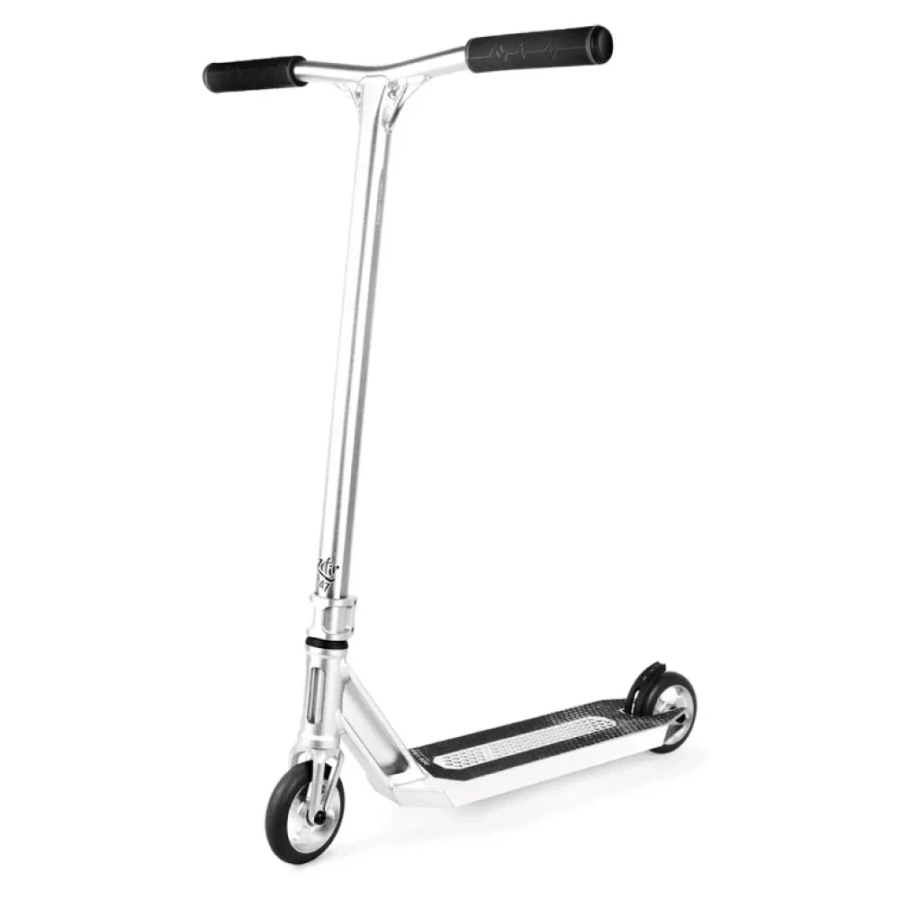 Комплектуется 110-миллиметровыми колесами, которые гарантируют отличное сцепление с поверхностью и плавное передвижение по скейтпаркам и уличным трассам. Черный цвет колес и серый цвет самоката создают неповторимый стиль и выделяют его среди других моделей.